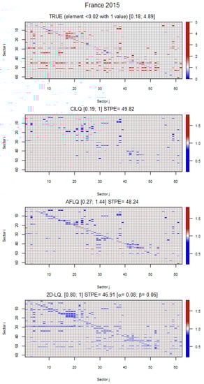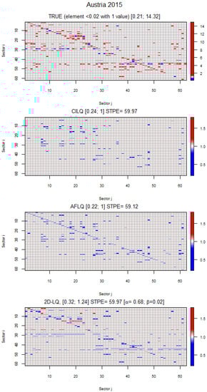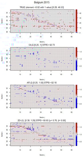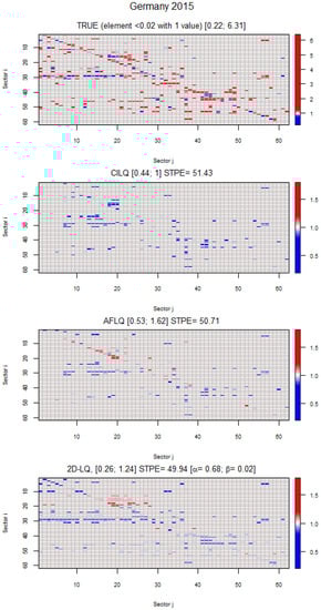 Turning to Germany, Figure 5 shows that the three LQs used here succeed in rectifying certain cells, although the “ideal” objective is not achieved. The STPE gradually decreases from 51.43 for CILQ to 49.94 for 2D-LQ. As a common pattern in the projected accounting frameworks, CILQ acts on a much more limited number of cells than the other techniques, apart from not affecting the main diagonal. The 2D-LQ is surprisingly positive since it intervenes in the necessary cells, yet it does not perform the rectifications in the desired direction. This circumstance suggests the possibility of introducing additional restrictions, or conditioning factors, in the basic formulation and its subsequent variants.