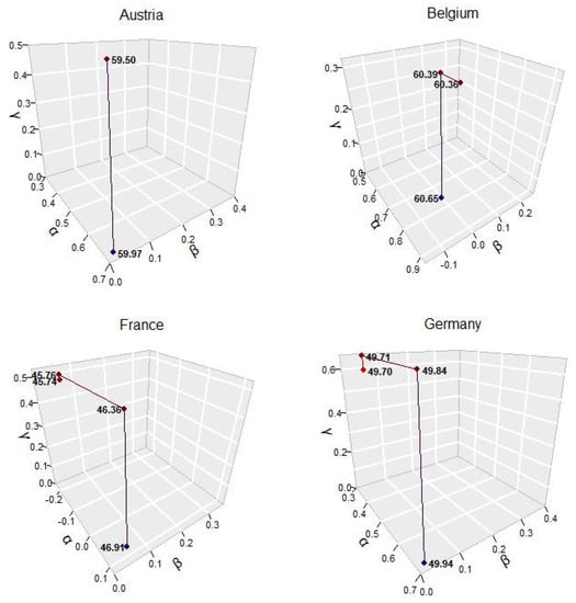 An iterative procedure is chosen to find the ternary that minimizes the STPE. It is described below. Each iteration encompasses two phases. We start from the initial pair that optimizes the basic 2D-LQ. From there, the associated is calculated, which will then be used to simultaneously recalculate . The following iterations continue similarly until the optimal ternary is achieved by convergence. A graphic depiction of the search process for this ternary should be helpful. Figure 6 shows the iterative processes in the technical coefficient matrix for the selected countries. For the sake of clarity in the interpretation, Appendix A presents the data for these processes (Table A1 for technical coefficients and Table A2 for multipliers). Incorporating another parameter naturally modifies the values of and , albeit the latter only slightly. Convergence is immediate for Austria, and it materializes fairly quickly for the other three countries. In any case, the number of iterations is a minor issue because the results achieved are of greater interest. There is indeed a reduction in STPE in all the cases tested. Table A3 in Appendix A presents the optimal parameters for the different LQs, including those related to this methodological extension.