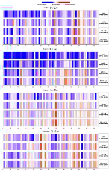 Figure 3 shows the same analytical arrangement for Belgium, which bears a close resemblance to the previous, though other aspects arise. Always incurring underestimations, CILQ again fails to correct many cells. Here, we can see how the AFLQ applies some upward correction, which is in fact permitted by its formulation. The FLQ would not allow it, but the enhanced version may contemplate it in some cases. The error using the 3 LQ techniques decreases from CILQ to 2D-LQ, going from 62.73 to 60.65. This is a frequent peculiarity, though there are some exceptions, such as in the case of Austria.