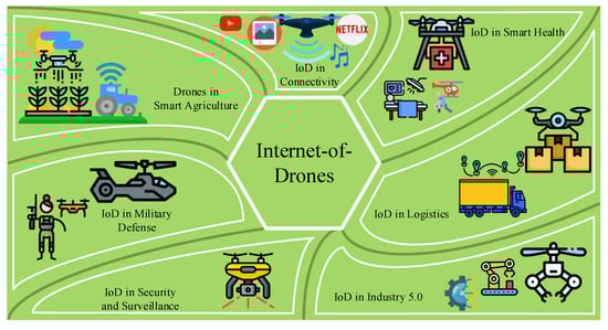 - Abualigah, L.; Diabat, A.; Sumari, P.; Gandomi, A.H. Applications, Deployments, and Integration of Internet of Drones (IoD): A Review. IEEE Sens. J. 2021, 21, 25532–25546. [Google Scholar] [CrossRef]