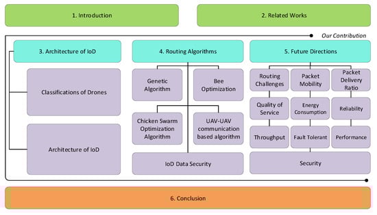Non-terrestrial networks (NTNs) are considered to be prime components of B5G and 6G networks, and drones are major pieces in NTNs. Therefore, this article presents a review of IoD-based routing techniques and challenges and highlights areas for improvement of IoDs in the future. Figure 2 presents visual structure of the article in detail. The rest of the paper is structured as follows: Section 2 details the related work of IoDs. Section 3 describes the classification and architecture of IoDs. Section 4 presents review of the routing algorithms and describes the methods and techniques. Section 5 covers the challenges and future directions. The article is concluded in Section 6.