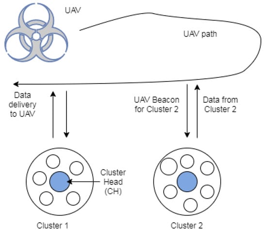 Consider Figure 5, which shows a drone-aided data gathering system. There are two clusters, each with a cluster head and number of sensor nodes. Data from a cluster is routed to a UAV and a UAV beacon is established.