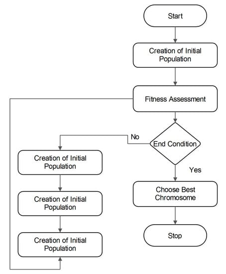 Drones are programmed to gain assistance from genetic algorithms through a programmable code that is accepted by their GUI. Each BS keeps track of the drone path possibilities with the help of GA. However, GA also has some disadvantages. The choice of all the parameters (fitness function, population size, and mutation and crossover rate) must be carried out very carefully. However, GA still remains one of the most important optimisation techniques. Figure 6 is a flow diagram that shows how routing is done with the help of GA. After creation of the initial population, a fitness assessment is made. If the end condition is reached, this is the choice of the best chromosome. If the end condition is not reached, the chromosome is subjected to crossover with a crossover probability and mutation with a respective mutation probability after which the chromosome reaches the fitness function. If it does not, it is eliminated. These best chromosomes give the paths of drones in a WSN cluster.