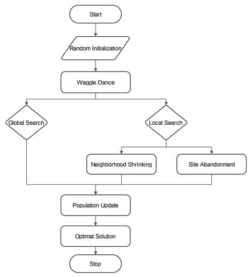After a random initialisation, the bees are subjected to a “waggle dance”, and the “food” search is divided into global search and local search. When the neighbourhood shrinks, the bees return or some of them abandon the site. All the information is treated as a population update that is a reduced number of paths. Finally, the quality check determines which paths the bees should take. The UAV would take the path in a similar manner using the bee optimisation algorithm.
