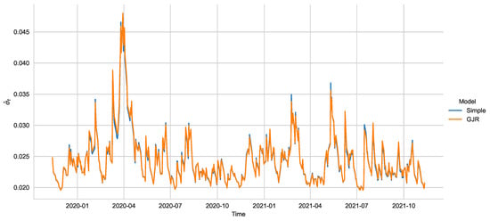 As an illustration of these features, we consider Grupo México for which the ARCH test reports a p-value of solidly rejecting the absence of heteroscedasticity. Fitting the GJR-GARCH, we obtain a p-value of 0.7664 for the Sign-Bias test, 0.5741 for the Negative Sign-Bias test, 0.4870 for the Positive Sign-Bias test and, finally, 0.6880 for the Joint Effect Sign-Bias test. All these results indicate that the series is actually better modelled by a symmetric GARCH process, from an econometric standpoint. Nonetheless, the quasi-maximum-likelihood estimation being consistent, the estimated variances are virtually indistinguishable. Figure 1 shows the estimated variances under two models: The GJR-GARCH with skewed t innovations and the simple GARCH model with normally distributed errors. All diagnostics point to the second as the better model.
