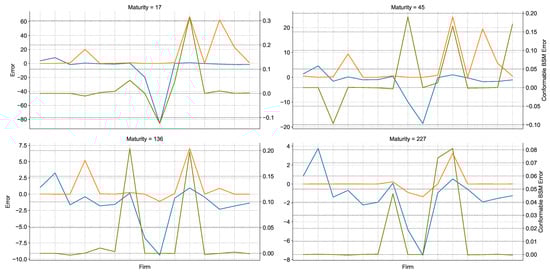 Figure 2 depicts the errors of each model for all the firms included in the study faceted by the time to maturity of the options. The blue and orange line share the left-hand vertical axis whereas the olive line is indexed to the right-hand y axis. As can be easily seen, the axes have very different scales in all cases, which immediately shows that the conformable BSM model is more flexible than the classical alternatives and produces a more accurate valuation. Furthermore, there does not appear to be any systematic pattern of under or over-valuation by the conformal BSM.
