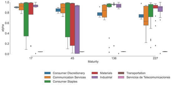 Figure 3 shows the dispersion of the estimated values for the conformable parameter grouped by Industry. Notably, higher maturities imply less dispersion in the estimate which is heteroskedastic in Industry. More specifically, Consumer Staples, Materials, and Industrial sectors present the highest variability overall, whereas Communication Services is the most variable for longer maturities. Note also that the value of is mostly close to 1, in which case the conformable BSM model is the classic BSM. It is important to emphasize that the conformal BSM worked best for firms and maturities with between 0.75 and 0.96, suggesting that only a slight deviation from the classical BSM is necessary to significantly improve the fit.