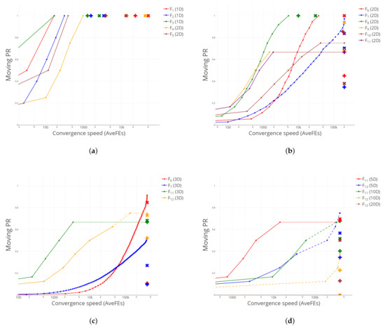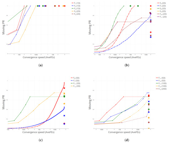 We can provide further insight into the good performance of CS compared to the baseline niching algorithms examining the values of the two new metrics mPR and mSR defined in Section 3.1. The available information in [34] for DE1 and DE2 is the average PR attained and the average number of FEs spent, computed over the NR = 50 runs and for an accuracy level . We have plotted these values in Figure 1, using plus and cross symbols for DE1 and DE2, respectively. Note that we have used a logarithmic scale on the abscissa axis for a better visualization. For the ease of viewing, we present four different plots, grouping the test functions according to their MaxFEs budget. Specifically, Figure 1a (MaxFEs = 50,000) displays functions to ; Figure 1b (MaxFEs = 200,000), – (all 2D); Figure 1c (MaxFEs = 400,000), , , and (all 3D); and Figure 1d (MaxFEs = 400,000), (5D and 10D) and (5D, 10D and 20D).
