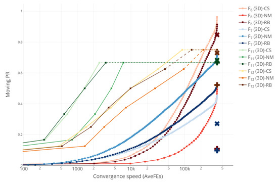 In consequence, if for a given test function, the associated performance curve lies above the corresponding plus and/or cross symbols, it means that CS has outperformed DE1 and/or DE2, respectively, in terms of PR, and vice versa. In the limiting case when the maximum value of the performance curve coincides with the score of either niching algorithm, the success rate SR and the convergence speed would be used as ancillary criteria, as indicated in [34] and reflected in Table 1.