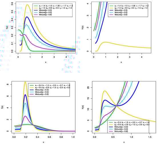 Some representative plots of the PDF and the hrf corresponding to the density in (6) for varying values of the mixing parameter p = are given in Figure 1.