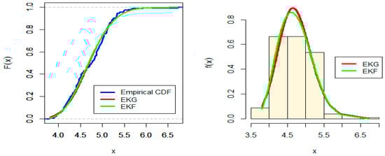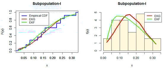 Figure 2 and Figure 3 show the Estimated CDF and PDF for EKG and EKF distribution for Subpopulation I and estimated CDF and PDF for EKG and EKF distribution for Subpopulation II. While, the PP-plot for EKG and EKF distribution for Subpopulation I and the PP-plot for EKG and EGF distribution for Subpopulation II are indicated in Figure 4 and Figure 5, respectively.
