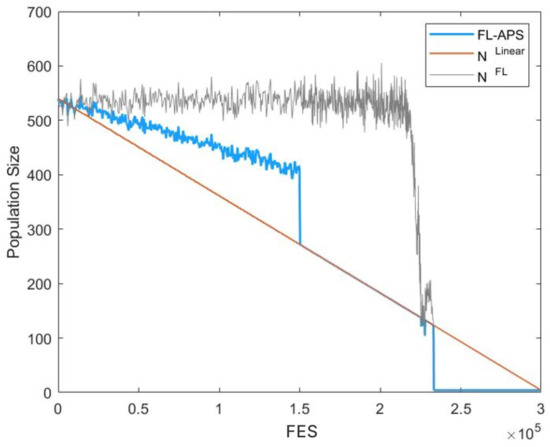 where is the LPSR mechanism calculated by Equation (8). At the early stage of iteration, the relationship between population size and the number of fitness evaluation is balanced by calculating the average value of and . It can not only maintain a relatively large population size for exploration but also avoid wasting too much computing resources in the early stage. At the later stage of iteration, the minimum values of and are selected to accelerate exploitation and lead to rapid convergence. To better illustrate the advantages of FL-APS, Figure 1 shows the reduction curve of FLADE population size on f6 benchmark function in CEC2014; the dimension number is set to D = 30, initial population size is set to , the minimum population size is set to Nmin = 4, and the maximum number of function evaluations is set to FES_max = 10,000 D. The FL-APS with the FESt = 1/2 ∗ FES_max is the default setting for the adaptation of population size. A more in-depth of the parameters of FL-APS will be discussed in Section 4.4. We can see from Figure 1 that the population size of FL-APS decreased more slowly than LPSR with the reduction of FES at the beginning of the evolution, which enables the population to maintain enough diversity to explore more areas in the early stage. In the last stage of the iteration, the population size decreased rapidly to accelerate the convergence as the fitness landscape characteristics φ decreased.