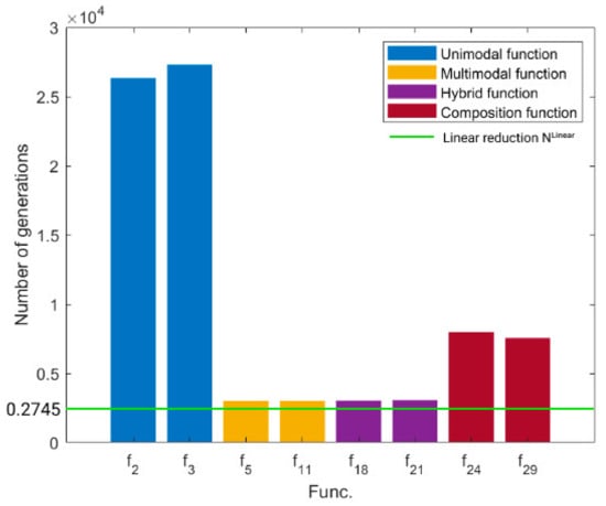 Illustration of the number of generations between the FL-ADE and LSHADE on different types of benchmark functions.