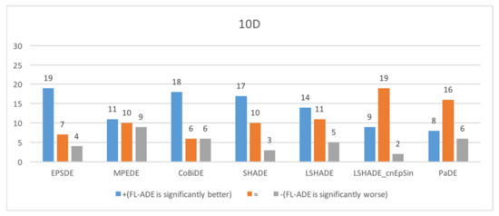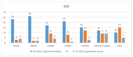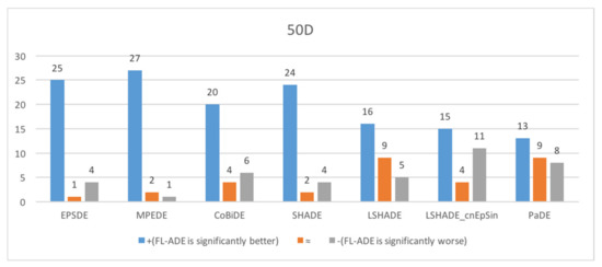 To demonstrate the efficiency of the proposed FL-ADE, seven high-performing state-of-art DE variants that appeared from 2011 to 2019 are selected in this research. The first competitor is EPSDE [45], which employed an ensemble of mutation strategies and control parameters. MPEDE [46] is the second algorithm to compare, which simultaneously consists of three mutation strategies. The third competitor is CoBiDE [47], in which the covariance matrix learning and the bimodal distribution parameters setting are incorporated into the DE framework. The fourth peer algorithm SHADE [22] uses a different parameter adaptation mechanism based on the success history to improve JADE [12]. The fifth contender is LSHADE [29], which enhances SHADE’s overall optimization performance by implementing a linear population size reduction technique, which helped LSHADE win the CEC2014 championship. The sixth competitor is the second place of the CEC2017 competition LSHADE_cnEpSin [40], which is an improved version of the first place of the CEC2016 competition LSHADE_EpSin [48]. The last comparison algorithm is PaDE [39], which proposes a novel control parameter adaptation schemes and a novel parabolic population size reduction scheme.