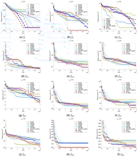 - From Figure 6b–f, we can see that FL-ADE can always find better solutions than other algorithms on the multimodal function , , , , . This is because the mutation strategy DE/current-to-pcbest gives FL-ADE a considerable advantage in multimodal functions.