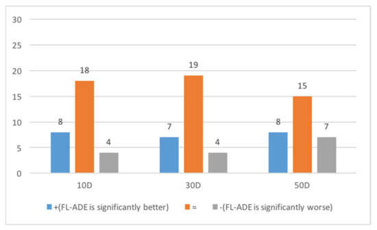 We can see from Table 6 that the FL-ADE with FL-APS obtains 26 better or similar performances in comparison with FL-ADE_linear on 10D, 26 better or similar performances in comparison with FL-ADE_linear on 30D, and 23 better or similar performances in comparison with FL-ADE_linear on 50D. Figure 7 summarizes the results between default FL-ADE and FL-ADE_linear on CEC2014 benchmark on 10D, 30D, and 50D. To summarize, the novel adaptive population size based on fitness landscape characteristic is meaningful and effective.