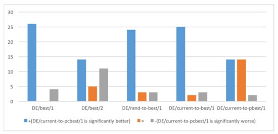To demonstrate the effectiveness of DE/current-to-pcbest mutation strategy, DE/best/1, DE/best/2, DE/rant-to-best/1, DE/current-to-best/1 and DE/current-to-pbest/1 are employed in this experiment. The same parameter setting of crossover rate CR = 0.9, scaling factor F = 0.5, and the population N = 100 are used for all mutation strategies. The experimental results are presented in Table 7 according to the Wilcoxon rank-sum test and the Friedman test; DE/current-to-pcbest/1 gets the first ranking among the six mutation strategies. The result of Wilcoxon rank-sum is summarized in Figure 8; obviously, the DE with strategy DE/current-to-pcbest/1 is better than the DE with other strategies.
