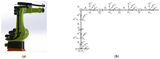 The 6-DOF robot and schematic diagram of its coordinate system. (a) 6-DOF robot; (b) Schematic diagram of coordinate system of 6-DOF robot.