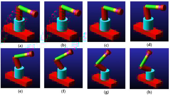 The poses at each time in the ADAMS simulation of the 6-DOF robot. (a) 0 s; (b) 0.3 s; (c) 0.6 s; (d) 0.9 s; (e) 1.2 s; (f) 1.5 s; (g) 1.8 s; (h) 2 s.