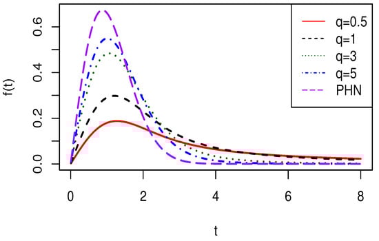 Figure 1 shows the pdf of the SPHN model for fixed values of , , and several values of parameter . This plot suggests that the right tail in this model becomes heavier as q becomes smaller.