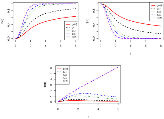 Plots of the cdf, survival and hazard function of are given in Figure 2 for and fixed and several values of q, ( corresponds to the ). On the other hand, plots for the cdf, survival and hazard rate function of SPHN model, taken , for (), and , by considering increasing values of q are given in Appendix A.1 and Appendix A.2, respectively.