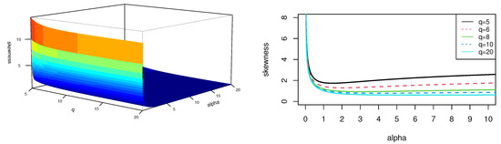 In (6), is a scale parameter, whereas and are shape parameters. It will be seen in Section 2.3 that q increases the range of possible values for the kurtosis coefficient in the SPHN model with respect to the PHN distribution. In the next proposition, the pdf of (6) is obtained.