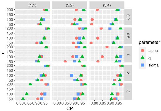 Following reviewers’ recommendations, similar plots to the ones proposed in [19] have been carried out to illustrate the results in Table 3. So, the empirical coverage probabilities obtained for the asymptotic confidence intervals at 95% for , and q for the sample sizes have been plotted in Figure 6. The columns correspond to the cases , and in Table 3 and the panels by rows to . It can be appreciated there that, in all cases, the empirical coverage probability approaches the confidence level 0.95 as the sample size increases. This plot also suggests that the approximate confidence intervals for q and perform better than those for .