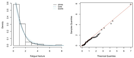 Figure 7 shows the histograms for the fatigue fracture data set, along with the fitted distributions by using ML estimates in SPHN, GHN and SGHN models. The QQ-plot is also included to asses the good fit provided by the SPHN model to this data set.