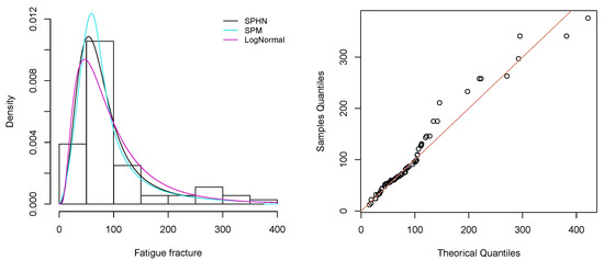Left panel: Histograms of the fatigue fracture data fitted with the GHN, SGHN and SPHN distributions. Right panel: QQ plot for the SPHN distribution.