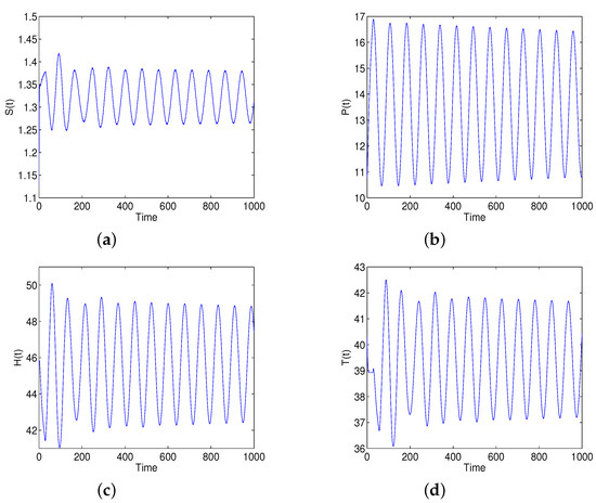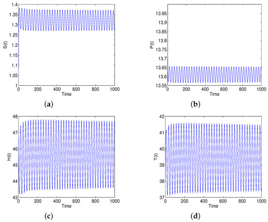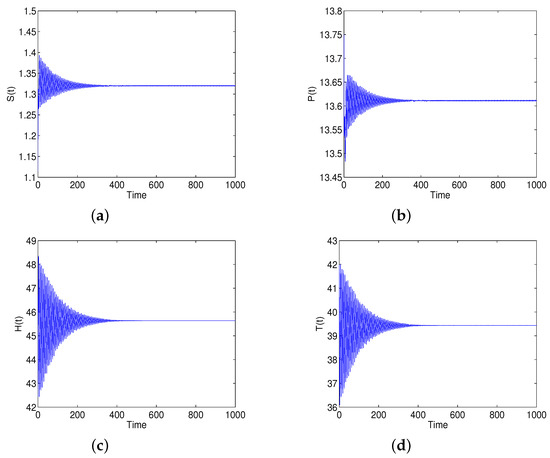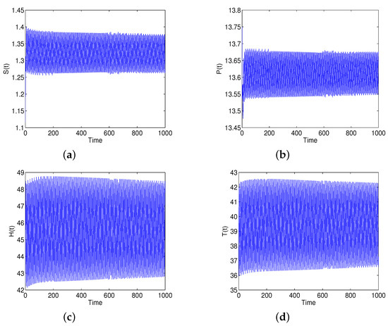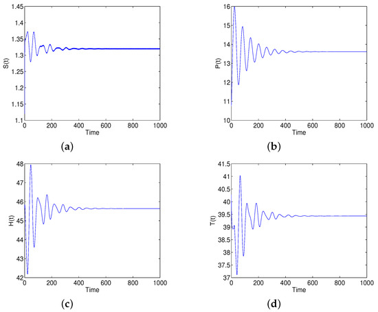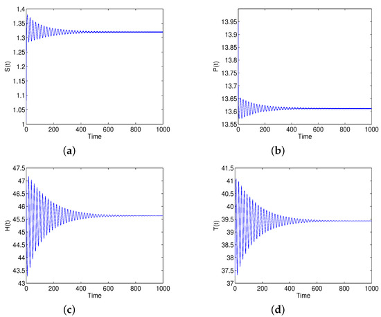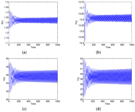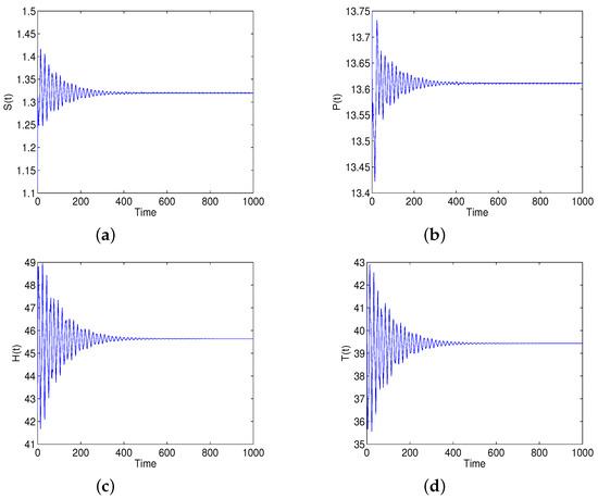 For and , we have and based on some calculations. It can be observed that the model system (47) is locally asymptotically stable around based on some calculations. It can be observed that the model system (47) is locally asymptotically stable around when , which is depicted in Figure 3. Nevertheless, loses its stability and the model system (47) experiences a Hopf bifurcation as the value of crossed . The loss of stability dynamics of for is shown in Figure 4.