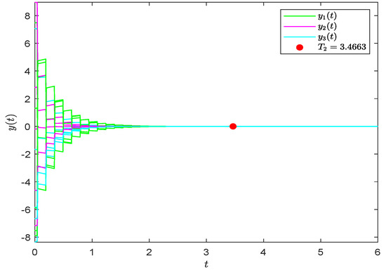 Remark 2. The FT stability and the estimation of settling time are given in Lemma 2 when . Note that if system (5) has no impulse, i.e., , we can get , and by using the equivalent replacement,So, when , the ST is estimated asIn Lemma 3, similarly, when , the ST is evaluated by Remark 3. Compared with Lemma 2 given in [36], a general condition is provided in Lemma 3, in which the linear term is involved. It makes Lemma 3 more flexible and the subsequent control design more pithy. 3. Fixed-Time Synchronization