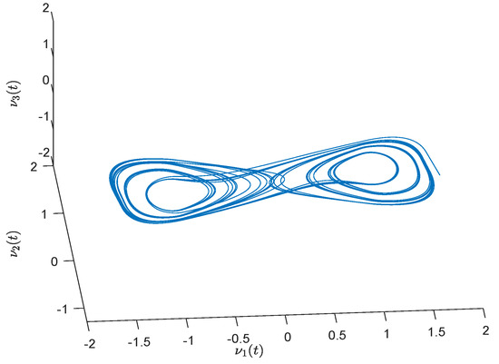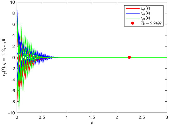 Corollary 2. Based on Assumptions 1–3 and the control protocol (8), if there exists satisfying (9), then system (18) is FT synchronized at the fixed time , where When there is no impulsive interference, system (2) is changed into the following form Corollary 3. Under Assumptions 1 and 2 and the control protocol (8), systems (19) achieves FT synchronization, the ST is evaluated by Remark 5. In the existing results [27,28,29,30], the synchronization for fuzzy-based complex networks was investigated. Differently, Yang et al. [31] and Behinfaraz et al. [32] considered the impact of impulse on fuzzy-based complex networks. However, the above results are about the asymptotic and finite-time synchronization of fuzzy complex networks, in which the initial values need to be obtained in advance. Different from the above results, a fixed-time fuzzy control strategy is designed, and the synchronization of impulsive coupled network is deeply explored based on T-S fuzzy logic theory in this paper, in which the synchronization time is independent of the initial state of the system. Remark 6. In [36,37,39], FT synchronization has been discussed for complex networks with impulsive effect by designing the following hybrid control strategy composed of linear part and power-law term:where , , . Actually, the linear part is only to ensure asymptotic synchronization, while the power-law term is the core to achieve FT synchronization. Based on this idea, a new FT stability theorem is proposed for impulsive system in Lemma 3 to facilitate the design of pure power-law control scheme (8), and the FT synchronization of fuzzy-based impulsive coupled networks is also ensured under the new design in this paper. Evidently, our control design is simpler and effective. Remark 7. Over the years, there have been many excellent results on the synchronization of complex networks [33,34,35,36,37,38,39,40,41,45,46]. Specially, the influences of actuator saturation and stochastic coupling strength on the network were considered in [45]. Besides, the passivity-based synchronization for complex networks under Markovian jump parameters, actuator fault and random coupling delay was considered in [46]. In these articles, the effects of random perturbations on network dynamics are covered, which is more consistent with many real-world applications, since systems are often subject to unpredictable sudden changes and sudden environmental disturbances. Therefore, it is of practical significance to apply the methods of control design and theoretical analysis proposed in this paper to further study the fixed-time control of complex networks with random disturbances, which will be one of the directions of future research. 4. Numerical Example