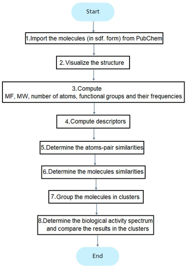 Figure 2 contains the study flowchart. After importing the molecules (step 1), their structures are drawn (step 2). The molecular formula (MF) and weights (MW), number and types of atoms, and functional groups are determined (step 3). The descriptors computed at the fourth stage, using the ChemmineOB package, are the Hydrogen Bond Acceptors (HBA1, HBA2) and Donors (HBD), log P, the molar refractivity, and topological polar surface area (TPSA) [39]. The reader may refer to [41,42,43,44,45,46,47] for details on these descriptors. The descriptors are utilized to group the molecules into clusters.