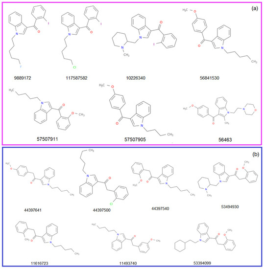 The similarities of the molecules’ couples, one belonging to Benzoylindoles and the other to Phenylacetylindoles, indicated by the Tanimoto coefficient, are shown in Table 6. The rank of the similarity is given in brackets. Minus (−) signifies that the similarity rank is higher than eight. The molecule with the ID 53394099, absent from the table, has a similarity rank higher than eight, along with all the molecules in the first group.