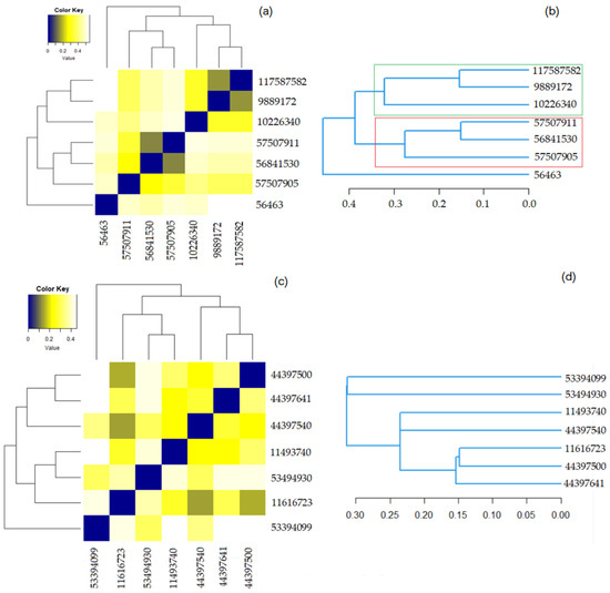 Figure 5a shows that the most similar molecules in Group 1 are those in the couples (9889172, 117587582) and (56841530, 579507911), for which the Tanimoto coefficient is equal to 0.900 and the overlap coefficient is 0.9583. The second highest similarity is between (10226340, 117587582) and (10226340, 9889172). Both have the overlap coefficient of 0.9583 and the Tanimoto one is equal to 0.8519.