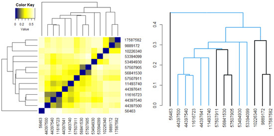 An analogous approach was followed for the 14 molecules, without considering the groups’ appurtenance. The heatmap and the dendrogram are shown in Figure 6. It results that molecule 56463 presents the highest dissimilarities to the others. The most similar Benzoylindoles are those with CIDs 9889172, 117587582 and those with CIDs 56481530, 957507905. Among the Phenylacetylindoles, the highest similarities are those of the molecules with the second, third, and fourth CIDs in Table 6.