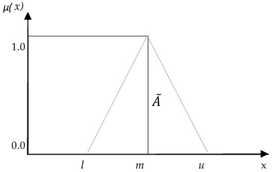 For our study, we consider a triangular fuzzy number, which is denoted by its vertices (l, m, u), as shown in Figure 1. Triangular fuzzy numbers are used to adapt decision makers’ preference to capture the vagueness of linguistic evaluations, where l, u and m, respectively, denote the lower bound, the upper bound and the crisp central value.