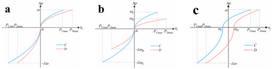 For instance, indicates a greedy cooperator whose reference point is . The relative payoff has been normalized by the range , which means the two cases and have the same maximum utility of 1. Compared to the utility value function (Equation (3)) in Prospect Theory, we have made two modifications by introducing and the payoff range . Thus, the utility judgment can be turned into probabilistic decision applied in evolutionary games (Figure 1a). By considering the differences between strategies C and D, such as (Figure 1b) and (Figure 1c), we can further explore the influence of asymmetric micro-dynamics on the evolutionary process.