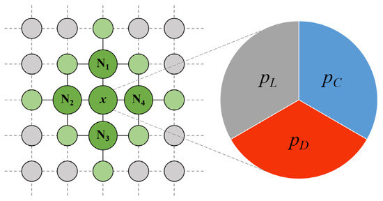 The commonly used Monte Carlo method in statistical physics has been applied in the simulations. individuals are located in an square lattice with periodic boundary conditions. In each step, a (player x) is randomly selected and makes a decision (C, D or L) according to the mixed strategy to play voluntary PGG with the 4 von Neumann neighbors (N1, N2, N3, N4). Thus, 5 players are involved in a single game and there would be no game if . In this approach, player x participates in 5 single games separately centered on itself and the other 4 neighbors (Figure 2). Hence we consider the average value