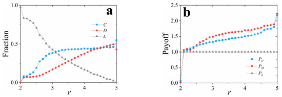 Given the nonlinearity and asymmetry of the micro-dynamics, we have different results (Figure 3) than in previous work [22]. The fraction of loners decreases monotonically with r. In addition, there is no extremum in the level of cooperation () and it increases as r increases; however, the promotion becomes insignificant when . With the same weight and reference point (, ) between C and D, the level of cooperation has been slightly promoted and the free riding is inhibited to some extent to a high value of r. Similarly, we can see in Figure 3b that the average payoffs for participants (C and D) are significantly lower than those of loners () as . In this case, most of the participants would drop out of the game as loners. Subsequently, cooperators and defectors can obtain more payoffs than loners as r increases so that more individuals participate in the PGG. Moreover, defectors benefit more than cooperators from games on average. Due to the promotion of cooperation, all the players participating in the PGG can obtain more payoffs than those who adopt the linear and symmetric micro-dynamic [22].