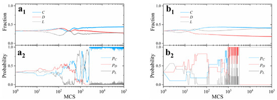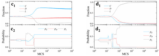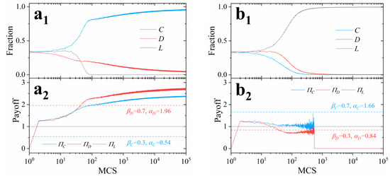 As shown in Figure 8a1, the fraction of cooperators quickly rises up to a high level () within 100 MCSs. With the foregoing discussions, this indicates that most individuals have increased the probability of cooperation in their mixed strategies. However, the fact is that the average payoffs for cooperators are objectively lower than those for defectors most of the time (Figure 8a2). It depends on the relative greediness between cooperators and defectors. For instance, easily satisfied cooperators subjectively believe they receive higher returns than greedy defectors as (Figure 8a2). On the contrary, greedy cooperators would drop out of the game as loners as (Figure 8b2). This leads to a sustained reduction in the number of cooperators and eventually results in non-participants in the system (Figure 8b1).