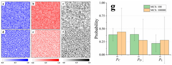 Distributions of , and in the population, as (a–c) and (d–f) for . The probabilities of C, D, and L in mixed strategy are shown in various degrees of blue, red, and black, respectively. (g) Statistical data of the mixed strategies of the population in different evolutionary periods. The other parameters are , , , , and .