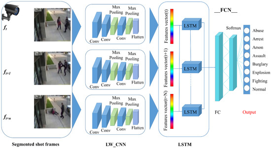 Compared to traditional methods, deep feature-based models have gained significant success in a variety of nonlinear high-dimensional data domains in the modern age, including activity identification and video summarization, among others. Liu et al. [14] developed a system in which video frames were encoded using a CNN, and anomalous events were detected using ConvLSTM. Their encoder encodes motion variation to detect abnormalities in a surveillance environment. Hasan et al. [15] proposed a convolution autoencoder and a RNN. Luo et al. [14] came up with a convolutional LSTM model with an autoencoder for video anomaly detection. Moreover, they expanded this work by detecting anomalies using a stacked RNN with an autoencoder. Liu et al. [16] proposed a technique for detecting video abnormalities by integrating a temporal and spatial detector. The discriminant saliency detector and a collection of dynamic texture features were treated in this model as normal training data events. Cheng et al. [17] developed a clustering-based deep autoencoder to extract information from normal events efficiently. Two modules are used to learn spatial-temporal feature regularity, and the spatial autoencoder in the first module handles the last individual video frame. In contrast, the temporal autoencoder in the second module operates and produces the RGB difference between the frames. Additionally, generative models are used for detecting anomalies in videos. For instance, Sabokroul et al. [18] came up with generative adversarial networks (GANs) for detecting abnormalities in a videos. This model teaches the normal distribution using GANs with discriminator and generator techniques. More recently, weakly supervised approaches for video labeling have been proposed where anomalous events are detected using C3D and MIL [19,20]. For example, Sultani et al. [5] developed a framework for detecting anomalous events based on weak video labels, and the MIL method. This model was trained on both normal and unusual videos by creating two distinct bags for common and uncommon events and then using the MIL technique to detect anomalous activity scores in the videos. Landi et al. [21] proposed a tube extraction technique that uses coordinates to build a regression model for abnormalities. Briefly, the average pooling layer combines the spatial features from the inception block with the temporal features of optimal flow before sending it to the regression model. Zhong et al. [22] developed a technique for detecting weakly supervised anomalies and a supervised system for action categorization with noisy labels. The novelty was keeping only the anomaly video labels noisy due to the unpredictable nature of the anomalous events. Additionally, a graph CNN was trained to clean up these noisy labels, and the activities were classified using an action classifier. Compared to the existing approaches, this paper proposed an efficient time-distributed 2D CNN with LSTM for anomaly detection in videos. The prominent features of the proposed method are discussed in Section 3.
