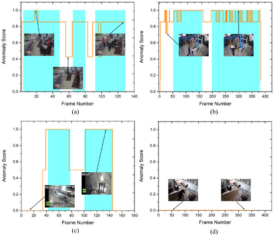 The curves of anomaly score, for four test videos from the test set of the UCF-Crime dataset (a) Arrest048-x264, (b) Fighting047-x264, (c) Assault051-x264, and (d) Normal-Videos-027-x264. Cyan regions denote the ground truth abnormal frames. For better representation, we normalized anomaly scores for every video into the range of [0, 1]. This demonstrates that, as anomalies arise, the anomaly scores increase. (For best results, view in color).