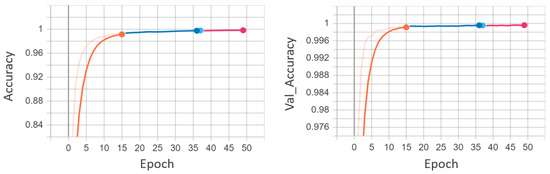 EADN training and validation accuracy graphs utilizing the UCF-Crime dataset. The training accuracy and the validation accuracy are plotted against the number of epochs. It is apparent from the graph that the model gets an optimal accuracy after 35 epochs. After 35 epochs, the model tends to overfit.
