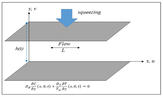 Assume that the unsteady fluid flow, heat, and mass transfer among the two plates are parallel in direction. The plates are bounded inside a squeezing channel. Consider the free stream squeezing flow, which begins from the tip of the plate, while the altitude is larger than the thickness of the boundary layer. There is no applied electric field and the magnetic Reynolds number is very small, and, hence, the induced magnetic field is neglected. Hall impact was also neglected. It is also considered that there is a microcantilever sensor between the two parallel plates, where the upper plate is squeezed and the lower plate is immovable, as shown in Figure 1. Keeping in mind these assumptions, the physical model of the fluid flow, heat, and mass transfer is given as [6,7,8]: