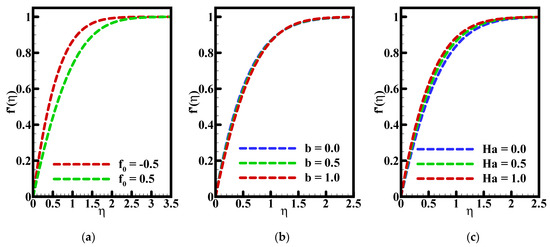 Impact of the parameters (a) (b) and (c) Magnetic parameter ( ) on the dimensionless velocity profile and numerous choices of emerging parameters.