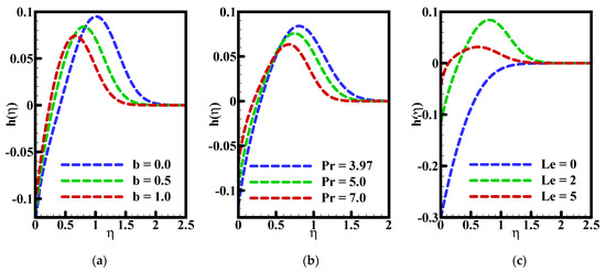 Effect of the parameters (a) (b) Prandtl number ( ), and (c) Lewin number ( ) on the dimensionless concentration profile and numerous choices of emerging parameters.