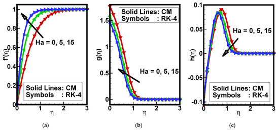 Comparison between the obtained solution with the collocation method (CM) and fourth-order Runge–Kutta (RK-4) of the dimensionless (a) velocity, (b) temperature, and (c) concentration profiles as varying Ha.