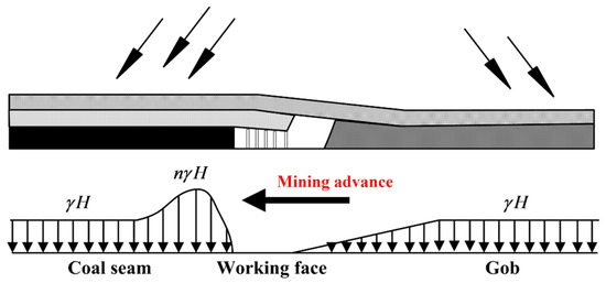 As shown in Figure 2, before coal mining, the stress of the rock mass stays in the original equilibrium, while the rock stress will redistribute after mining. According to the theory of mining pressure control [37,38], in the mining advancing direction, the peak abutment pressure of coal floor nγH appeared in the working face within a certain distance to the coal wall. Because the floor of the gob is compacted by roof caving rocks, the abutment pressure gradually recovers to the original stress γH, where γ is the bulk density of the rock, H is the depth of the buried coal seam, and n is the stress concentration factor.
